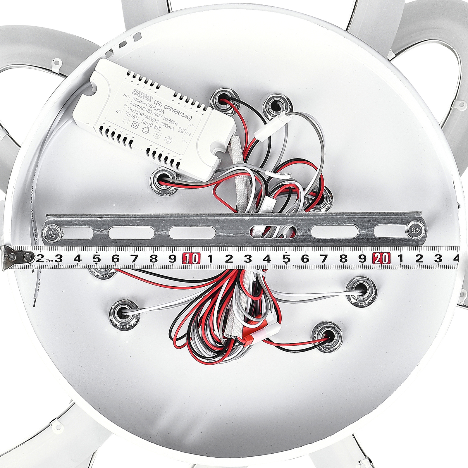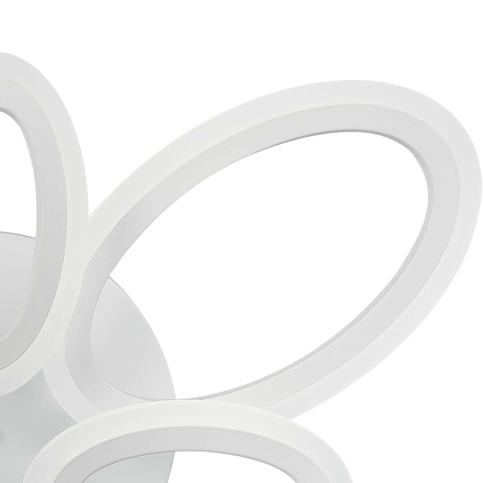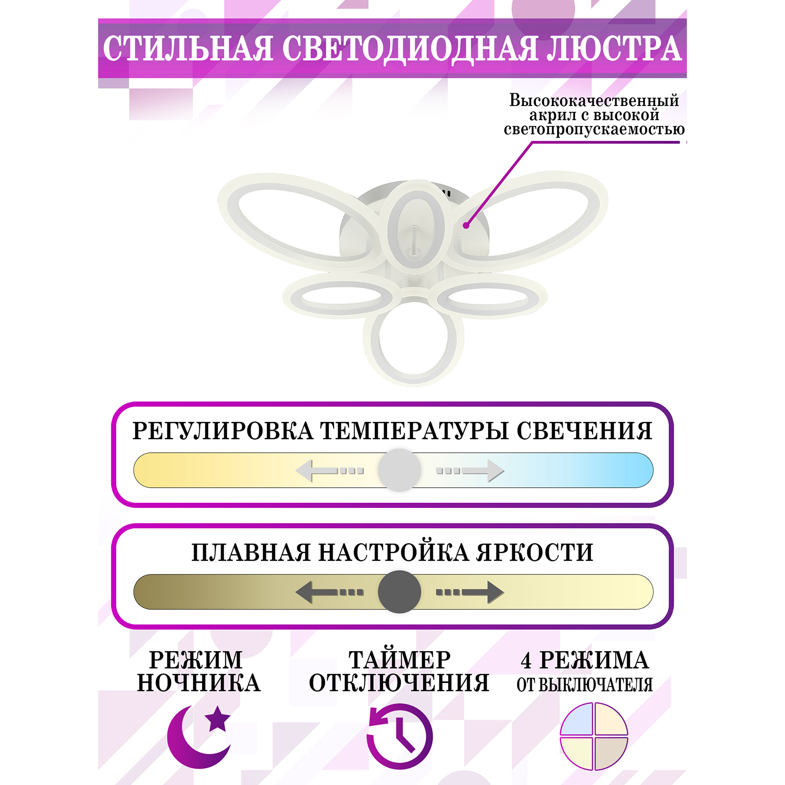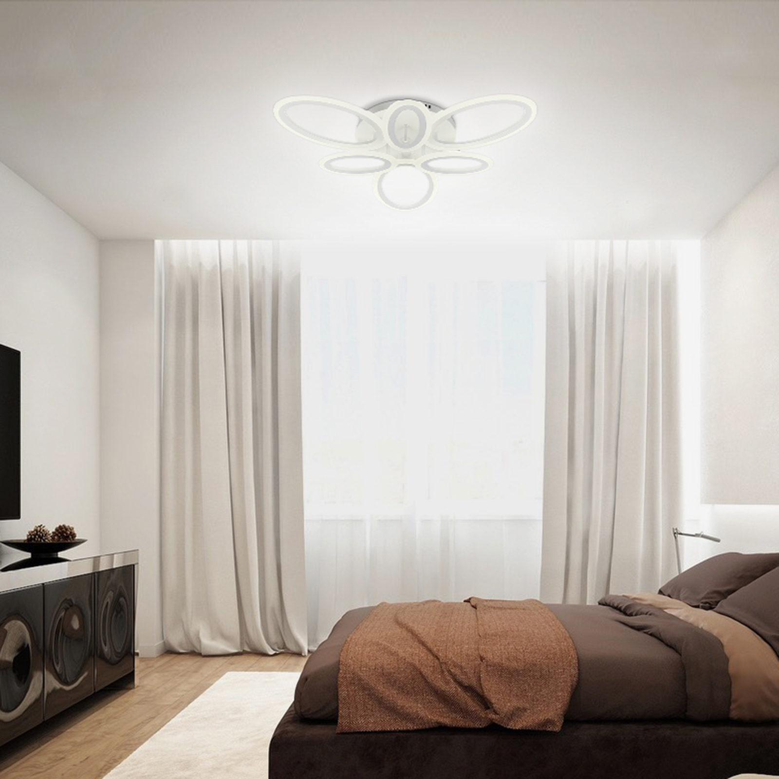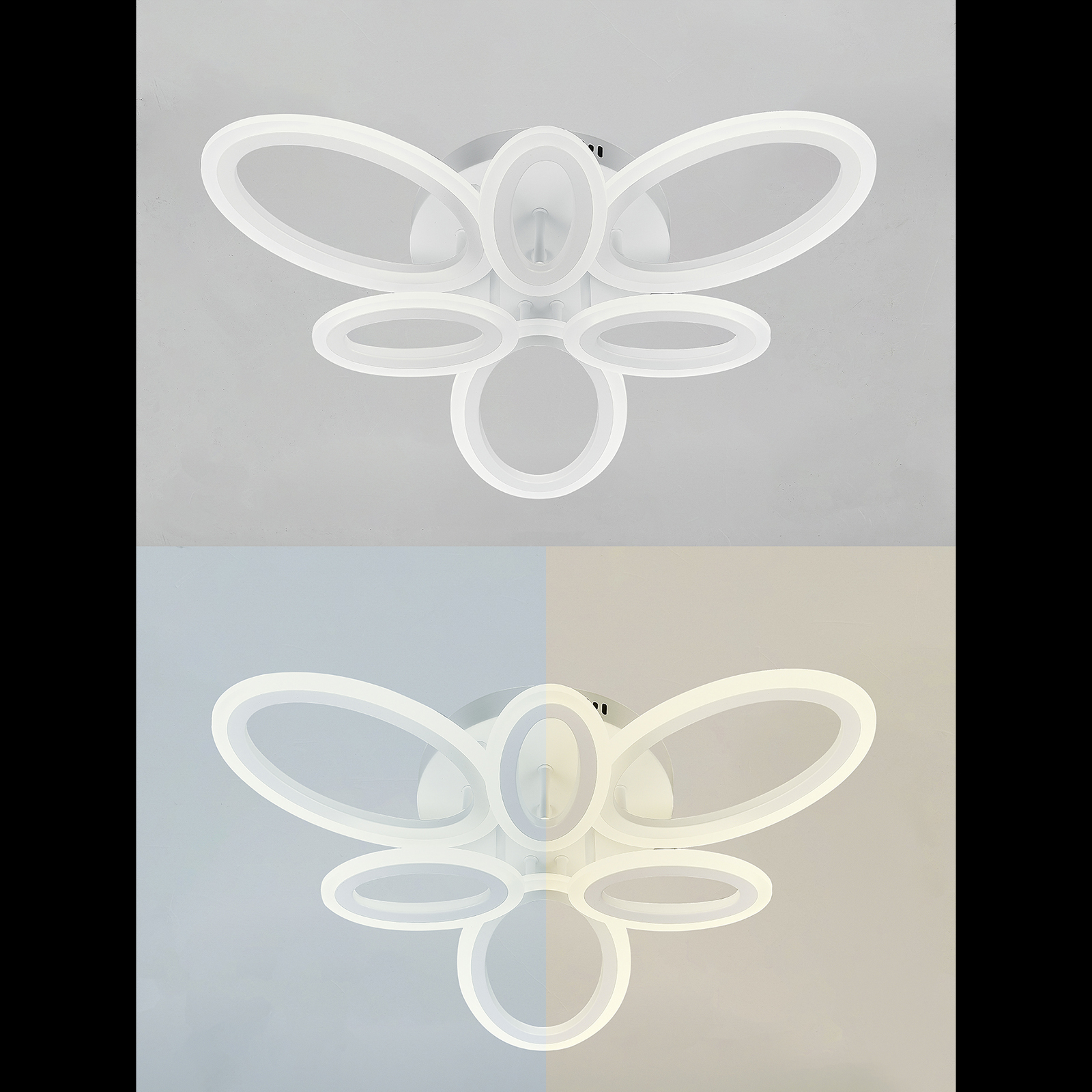 Светодиодный светильник с дистанционным управлением через пульт ДУ, смартфон, планшет. Лицевую часть составляют овальные рожки, которые обладают отличной эргономикой. По их периметру расположена подсветка, акрил обеспечивает отличное рассеивание света. Дизайн люстры выполнен в современном стиле в белом цвете и отлично подойдёт в любой интерьер. Люстра имеет тёплый, естественный и холодный свет с регулировкой температуры свечения. Обладает плавной настройкой яркости в диапазоне от 10% до 100%. Имеется режим ночника и таймер отключения. Кроме того, от стандартного выключателя люстра имеет 4 режима свечения. Данные функции делают светильник оптимальным в процессе использования. Общая мощность 100W со световым потоком 8000 lm позволяет осветить до 20 кв.м. Он прост в сборке, установке и экономичен в обслуживании. Светодиоды легко заменимы в случае перегорания. Люстра подойдёт для всех видов потолков. Цветовая температура настраивается от 3000 до 6500 K. Степень защиты 20 IP.