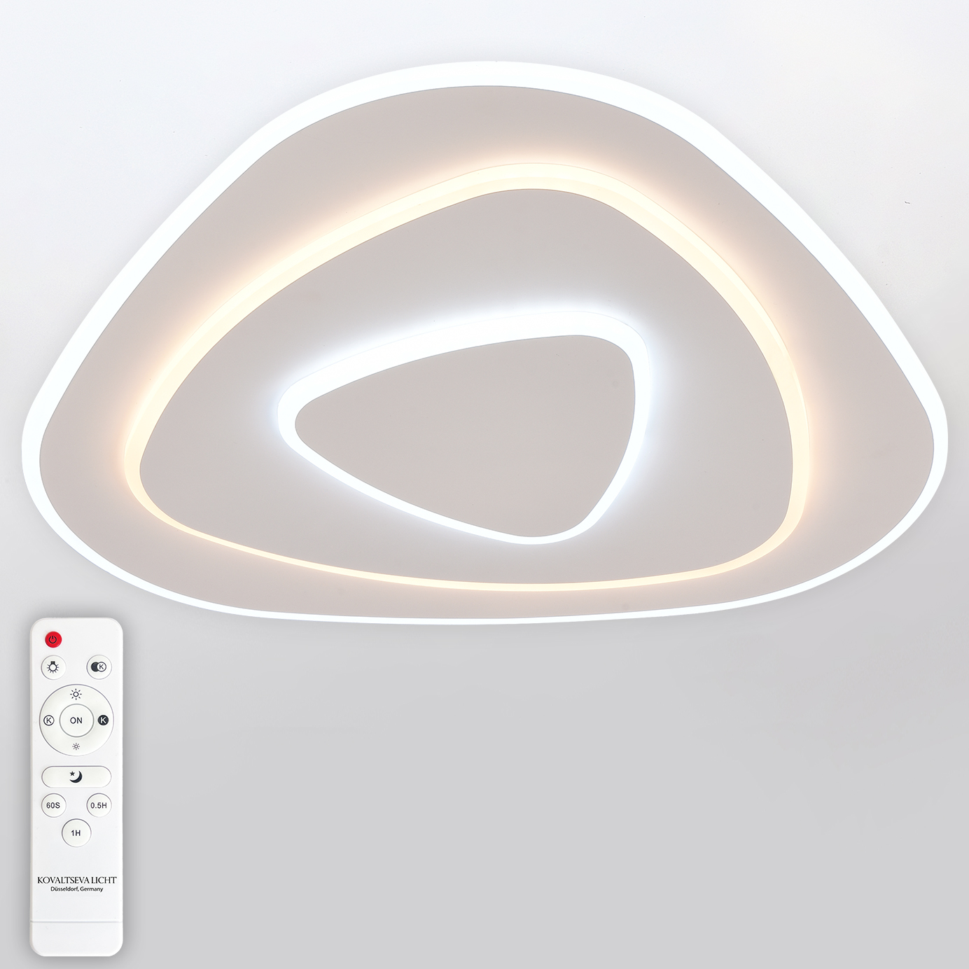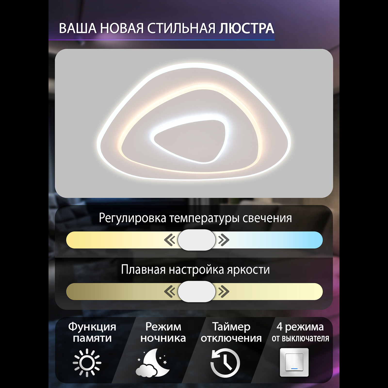 Светодиодный светильник из новой линейки FUTURE с дистанционным управлением через пульт ДУ. Современная форма люстры подчёркнута лаконичными изгибами рассеивателя по периметру. Люстра имеет тёплый, естественный и холодный свет с регулировкой температуры свечения. Обладает плавной настройкой яркости в диапазоне от 10% до 100%. Имеется режим ночника и таймер отключения. Кроме того, от стандартного выключателя люстра имеет 4 режима свечения. Данные функции делают светильник оптимальным в процессе использования. Общая мощность 120W со световым потоком 7200 lm позволяет осветить до 18 кв.м. Он прост в сборке, установке и экономичен в обслуживании. Светодиоды легко заменимы в случае перегорания. Люстра подойдёт для всех видов потолков. Цветовая температура настраивается от 3000 до 6500 K. Степень защиты 20 IP.