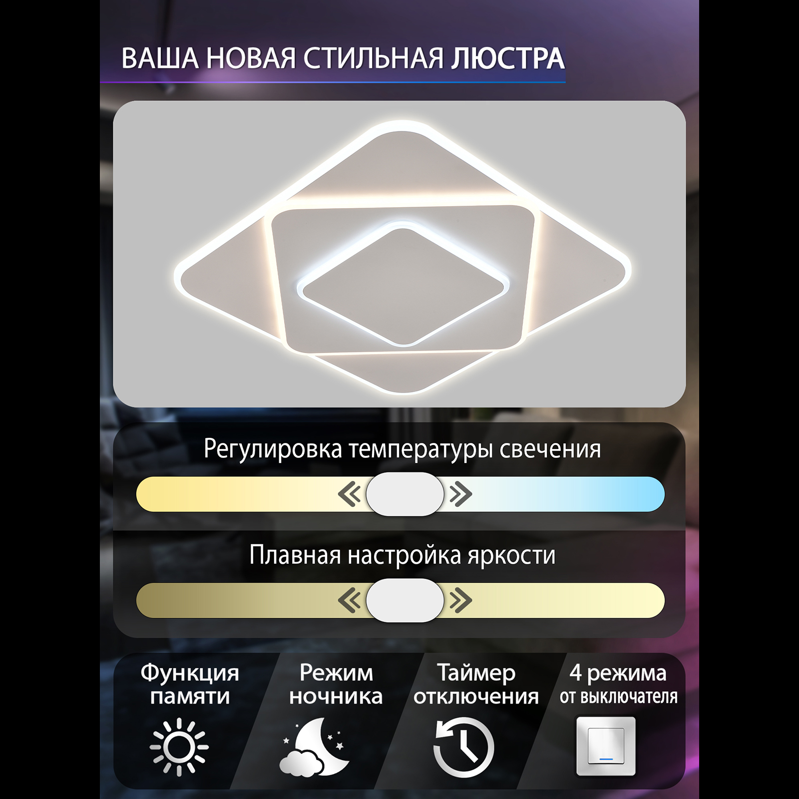 Светодиодный светильник из новой линейки FUTURE с дистанционным управлением через пульт ДУ. Современная форма люстры подчёркнута лаконичными изгибами рассеивателя по периметру. Люстра имеет тёплый, естественный и холодный свет с регулировкой температуры свечения. Обладает плавной настройкой яркости в диапазоне от 10% до 100%. Имеется режим ночника и таймер отключения. Кроме того, от стандартного выключателя люстра имеет 4 режима свечения. Данные функции делают светильник оптимальным в процессе использования. Общая мощность 140W со световым потоком 8400 lm позволяет осветить до 20 кв.м. Он прост в сборке, установке и экономичен в обслуживании. Светодиоды легко заменимы в случае перегорания. Люстра подойдёт для всех видов потолков. Цветовая температура настраивается от 3000 до 6500 K. Степень защиты 20 IP.