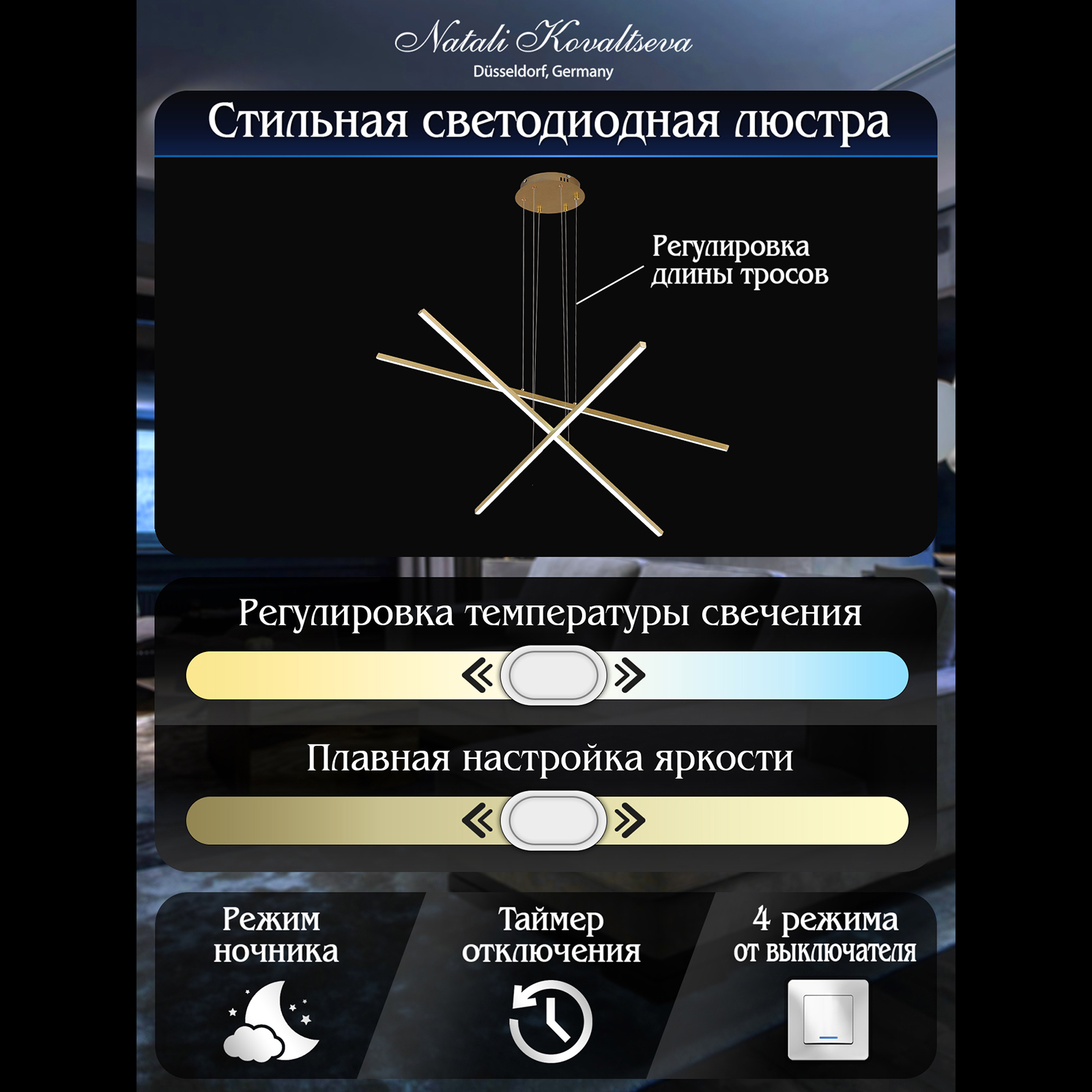 Светодиодный светильник люстра с пультом ДУ, моб приложением для управления со смартфона, планшета. Светильник имеет три строгие направляющие прямой формы. По периметру располагается контурное свечение, благодаря которому светильник подойдёт в любой интерьер. Высота люстры регулируется, можно настроить нужный наклон направляющей. Люстра имеет тёплый, естественный и холодный свет с регулировкой температуры свечения. Обладает плавной настройкой яркости в диапазоне от 10% до 100%. Имеется режим ночника и таймер отключения. От стандартного выключателя люстра имеет 4 режима свечения. Общая мощность 100W со световым потоком 6500 lm позволяет осветить до 14 кв.м. Он прост в сборке, установке и экономичен в обслуживании. Светодиоды легко заменимы в случае перегорания. Люстра подойдёт для всех видов потолков. Цветовая температура настраивается от 3000 до 6500 K. Степень защиты 20 IP.