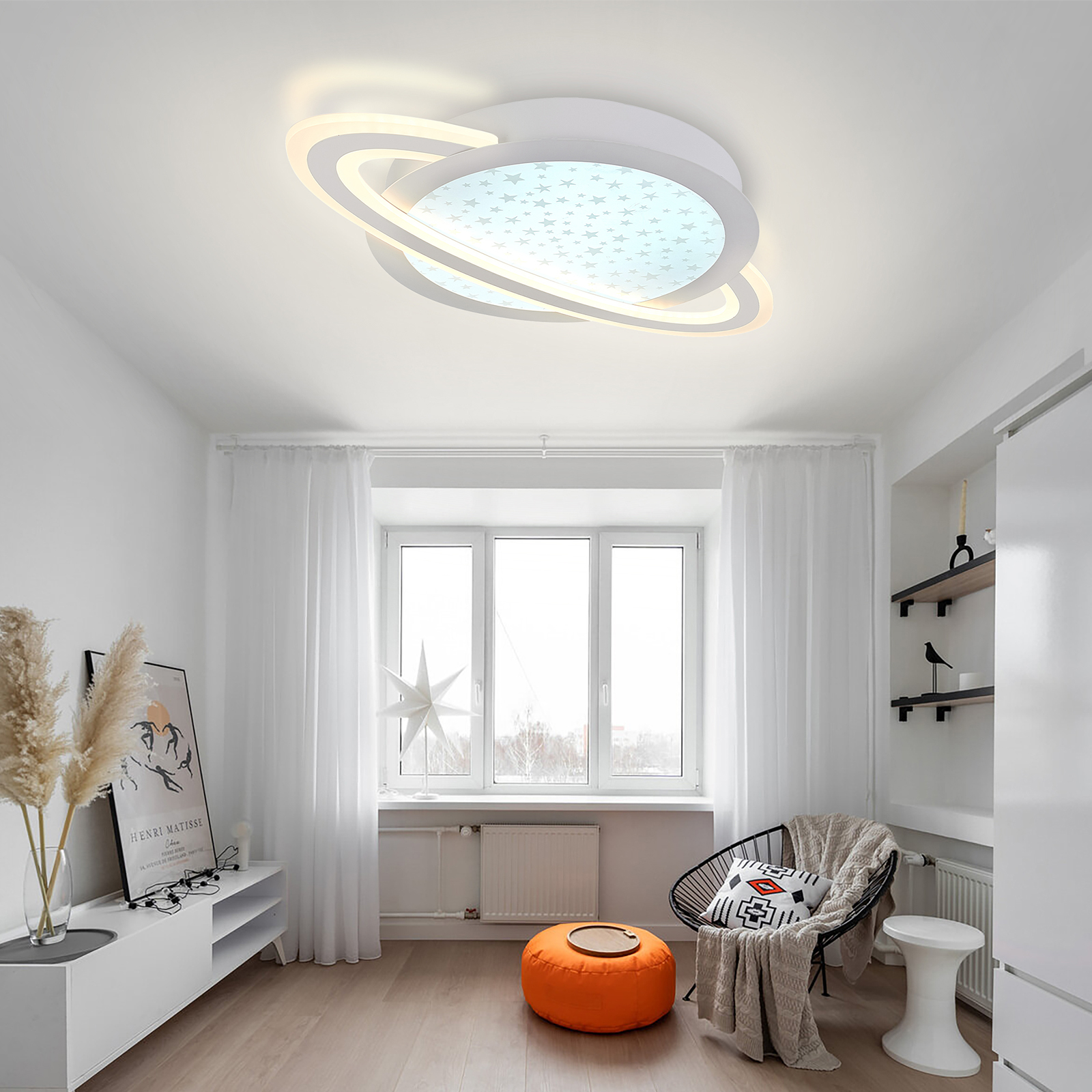 Люстра оснащена светодиодными лампами, что обеспечивает высокую энергоэффективность и долговечность. Общая мощность 80W со световым потоком 4800 lm позволяет осветить до 15 кв.м. Благодаря пульту дистанционного управления, вы можете легко регулировать яркость света, а также выбирать желаемый цвет освещения (теплый, холодный, нейтральный), создавая идеальную атмосферу в любой комнате.
