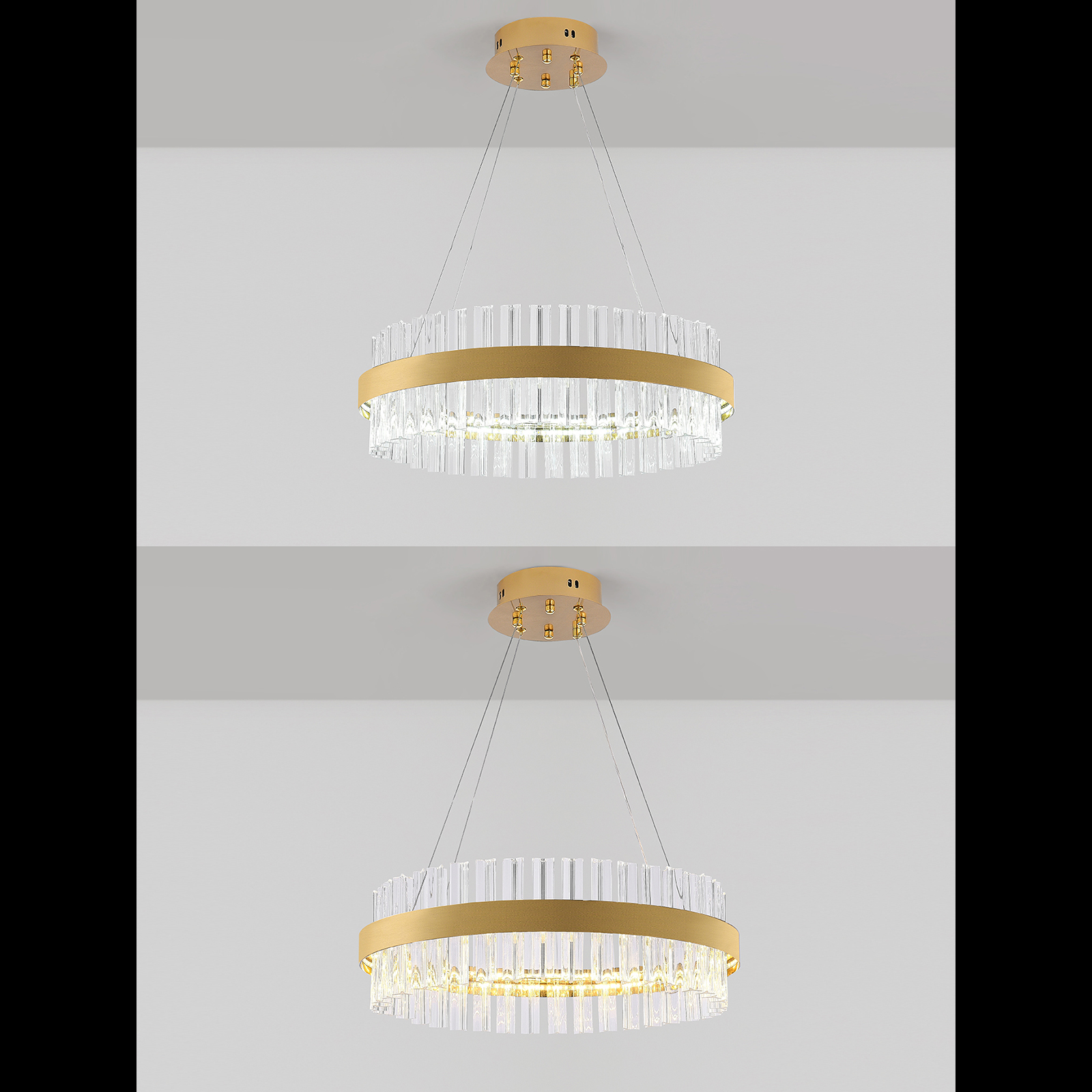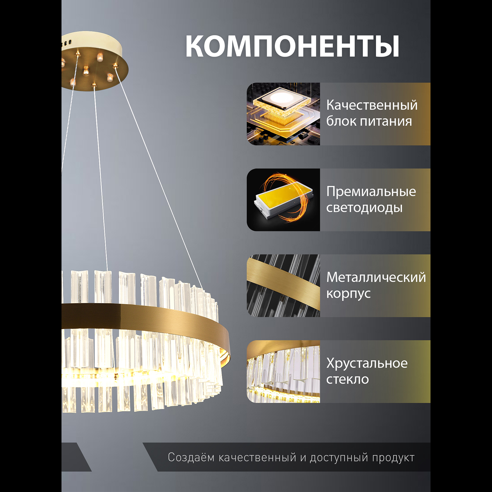 Люстра оснащена светодиодными лампами, что обеспечивает высокую энергоэффективность и долговечность. Общая мощность 100W со световым потоком 6000 lm позволяет осветить до 14 кв.м. Благодаря пульту дистанционного управления, вы можете легко регулировать яркость света, а также выбирать желаемый цвет освещения (теплый, холодный, нейтральный), создавая идеальную атмосферу в любой комнате.