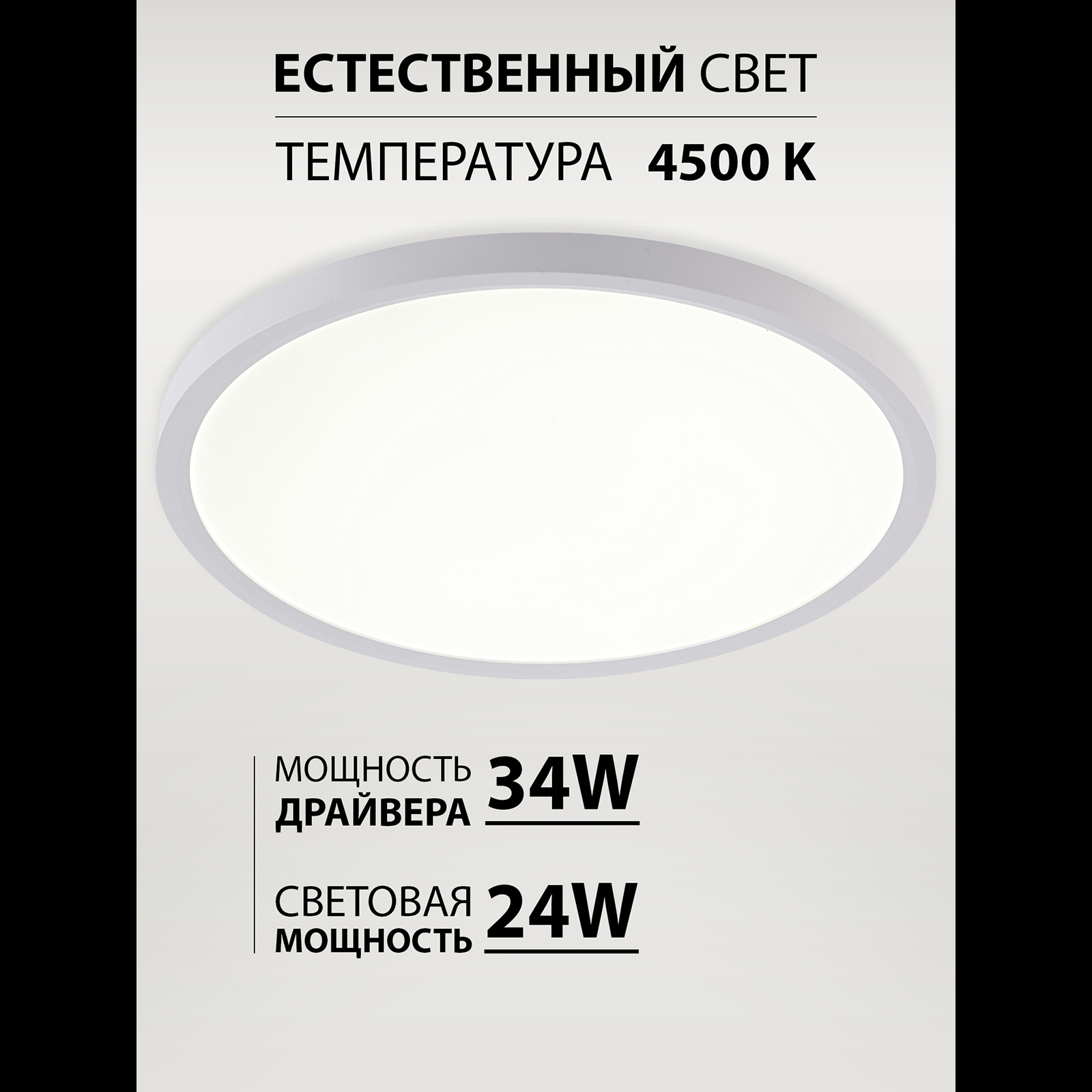 Светильник оснащён светодиодными лампами, что обеспечивает высокую энергоэффективность и долговечность. Общая мощность блока 34W позволяет выдавать световую мощность в 24W со световым потоком 2880 lm. Рассеиватель выполнен из поликарбоната, увеличивая площадь освещения до 12 кв.м. Температура свечения 4500K является оптимальным параметром естественного света, создавая идеальную атмосферу в любой комнате.