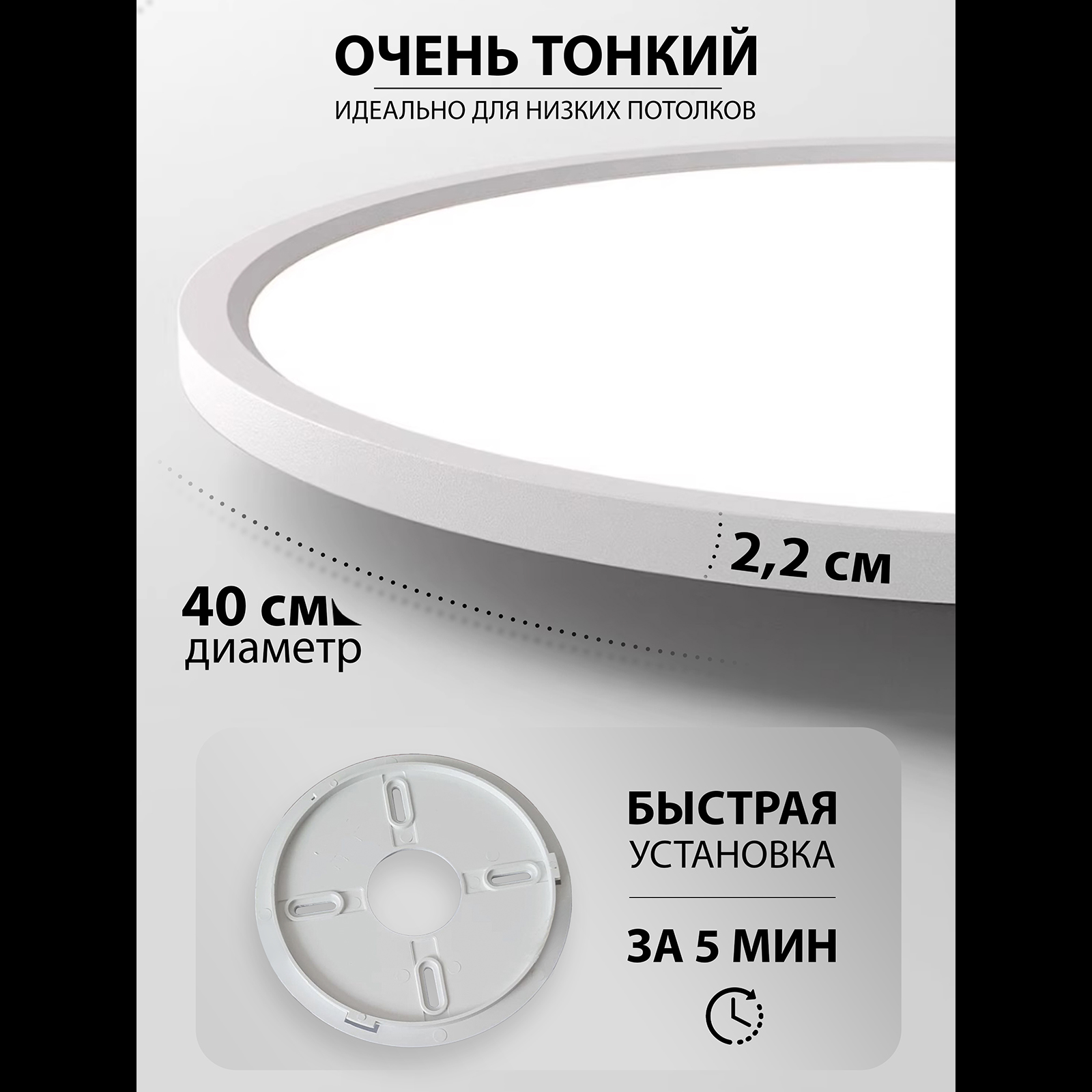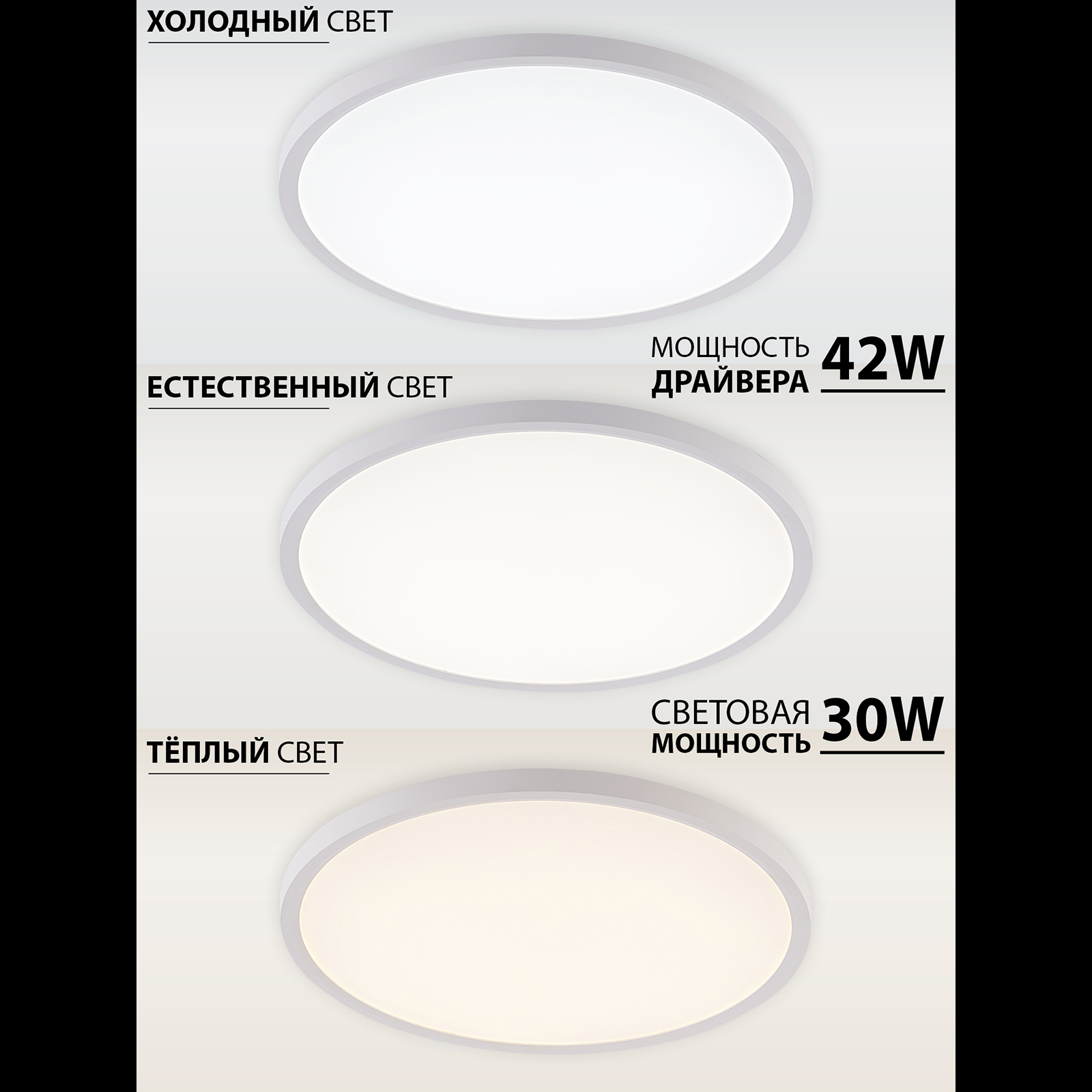 Светильник оснащён светодиодными лампами, что обеспечивает высокую энергоэффективность и долговечность. Общая мощность блока 42W позволяет выдавать световую мощность в 30W со световым потоком 3600 lm. Рассеиватель выполнен из поликарбоната, увеличивая площадь освещения до 16 кв.м. Светильник имеет три режима: холодный, естественный и тёплый свет свечения, создавая идеальную атмосферу в любой комнате.