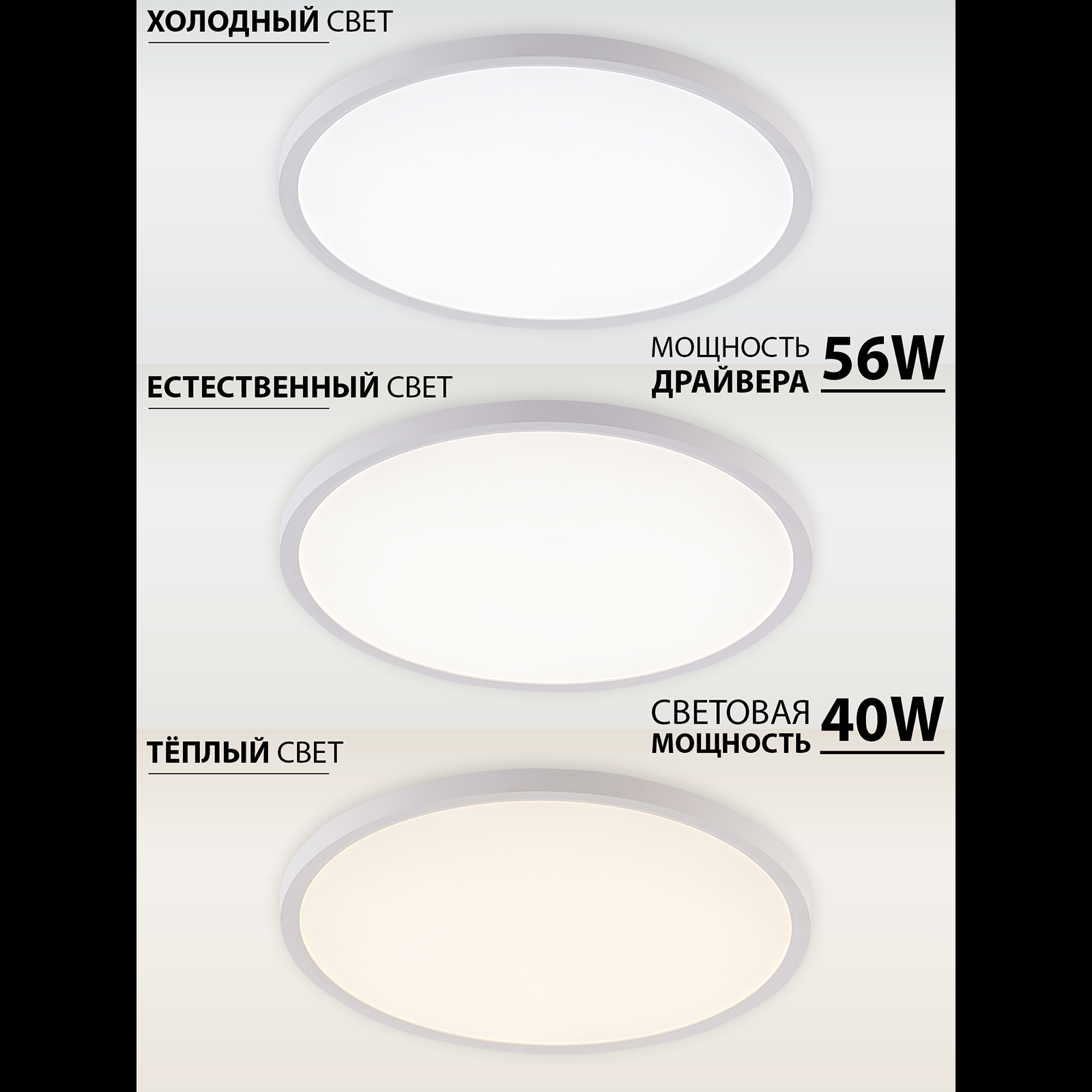 Светильник оснащён светодиодными лампами, что обеспечивает высокую энергоэффективность и долговечность. Общая мощность блока 56W позволяет выдавать световую мощность в 40W со световым потоком 4800 lm. Рассеиватель выполнен из поликарбоната, увеличивая площадь освещения до 20 кв.м. Светильник имеет три режима: холодный, естественный и тёплый свет свечения, создавая идеальную атмосферу в любой комнате.