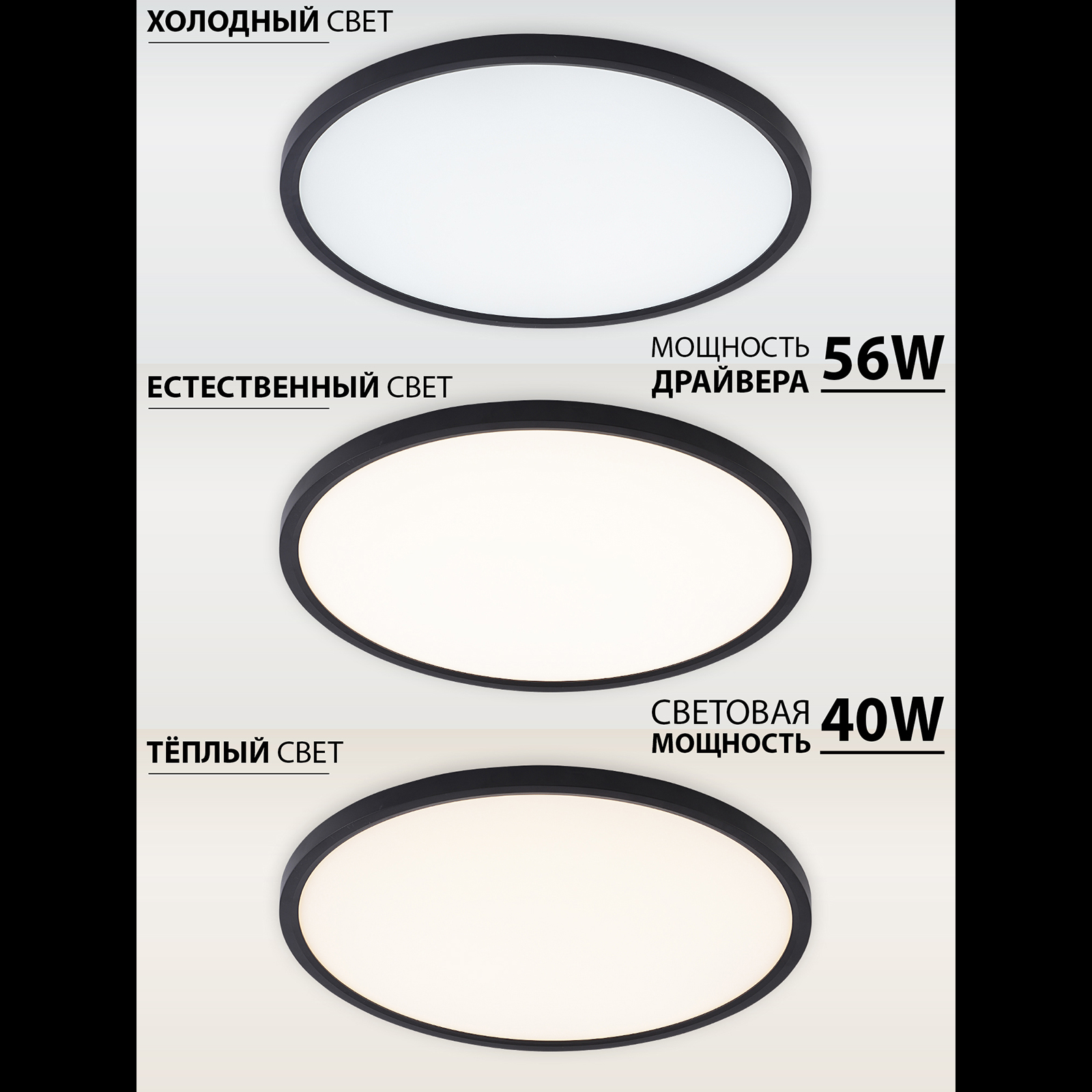 Светильник оснащён светодиодными лампами, что обеспечивает высокую энергоэффективность и долговечность. Общая мощность блока 56W позволяет выдавать световую мощность в 40W со световым потоком 4800 lm. Рассеиватель выполнен из поликарбоната, увеличивая площадь освещения до 20 кв.м. Светильник имеет три режима: холодный, естественный и тёплый свет свечения, создавая идеальную атмосферу в любой комнате.