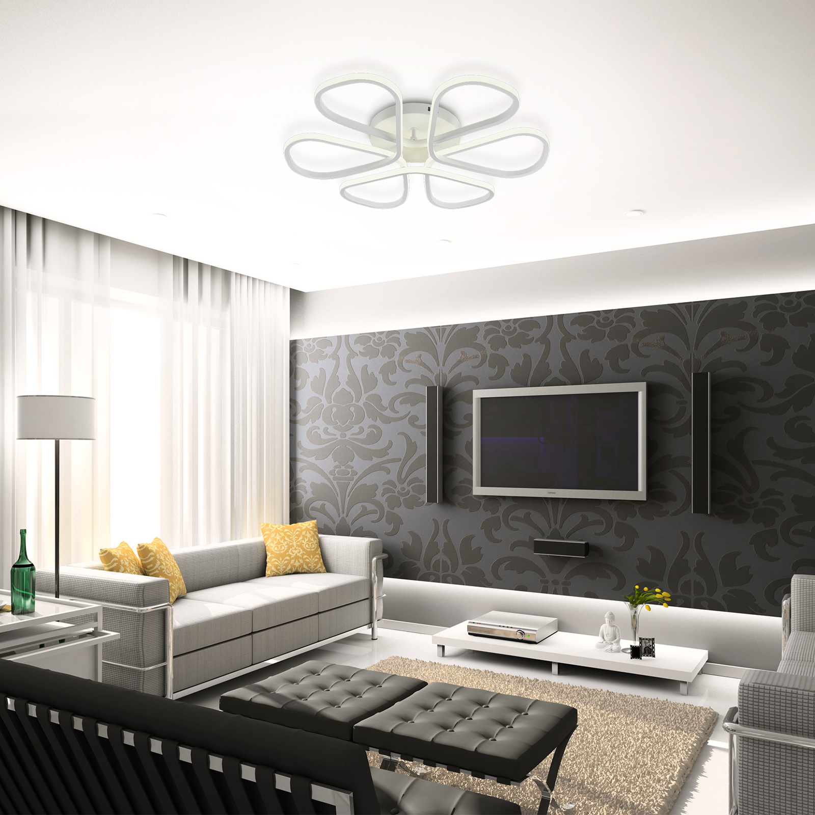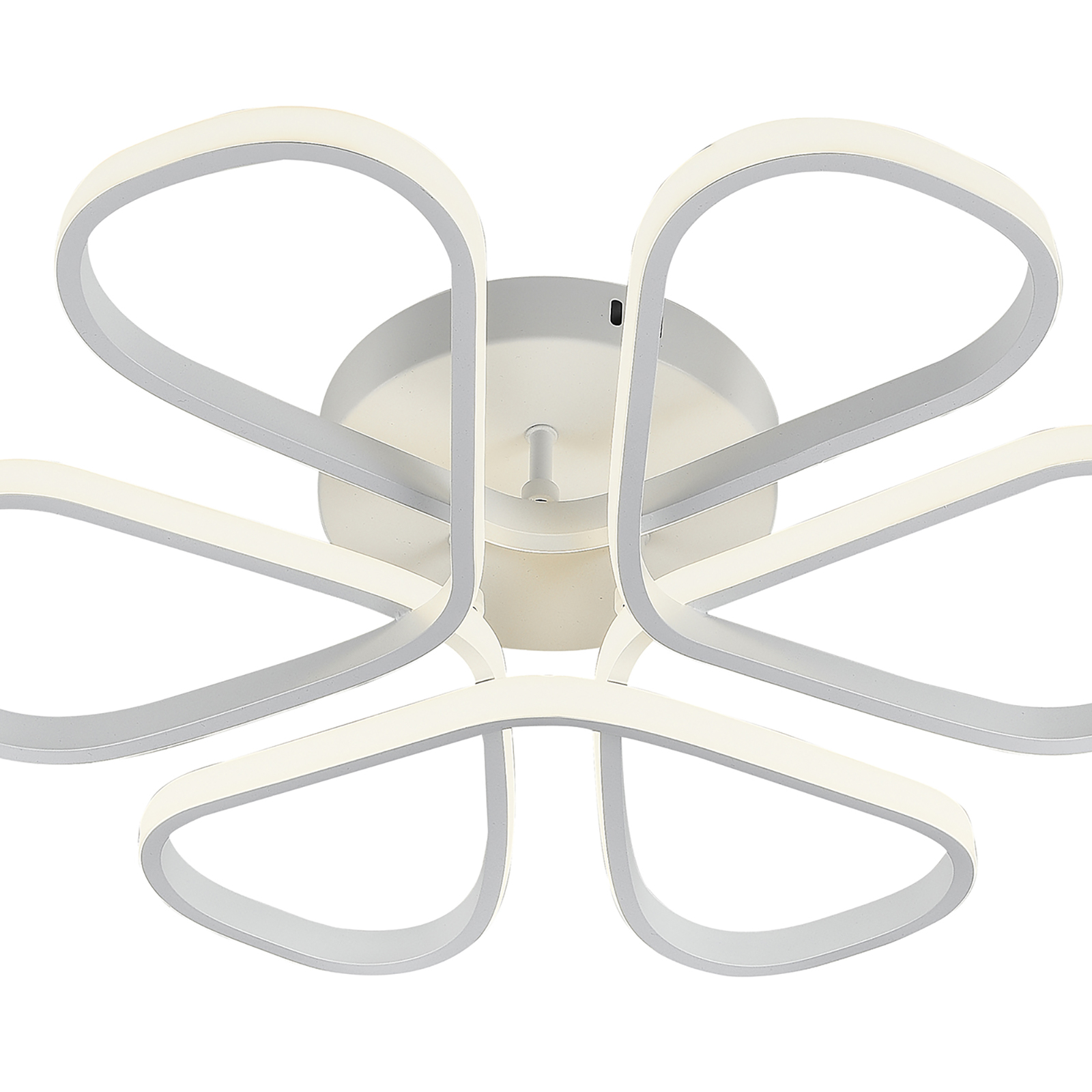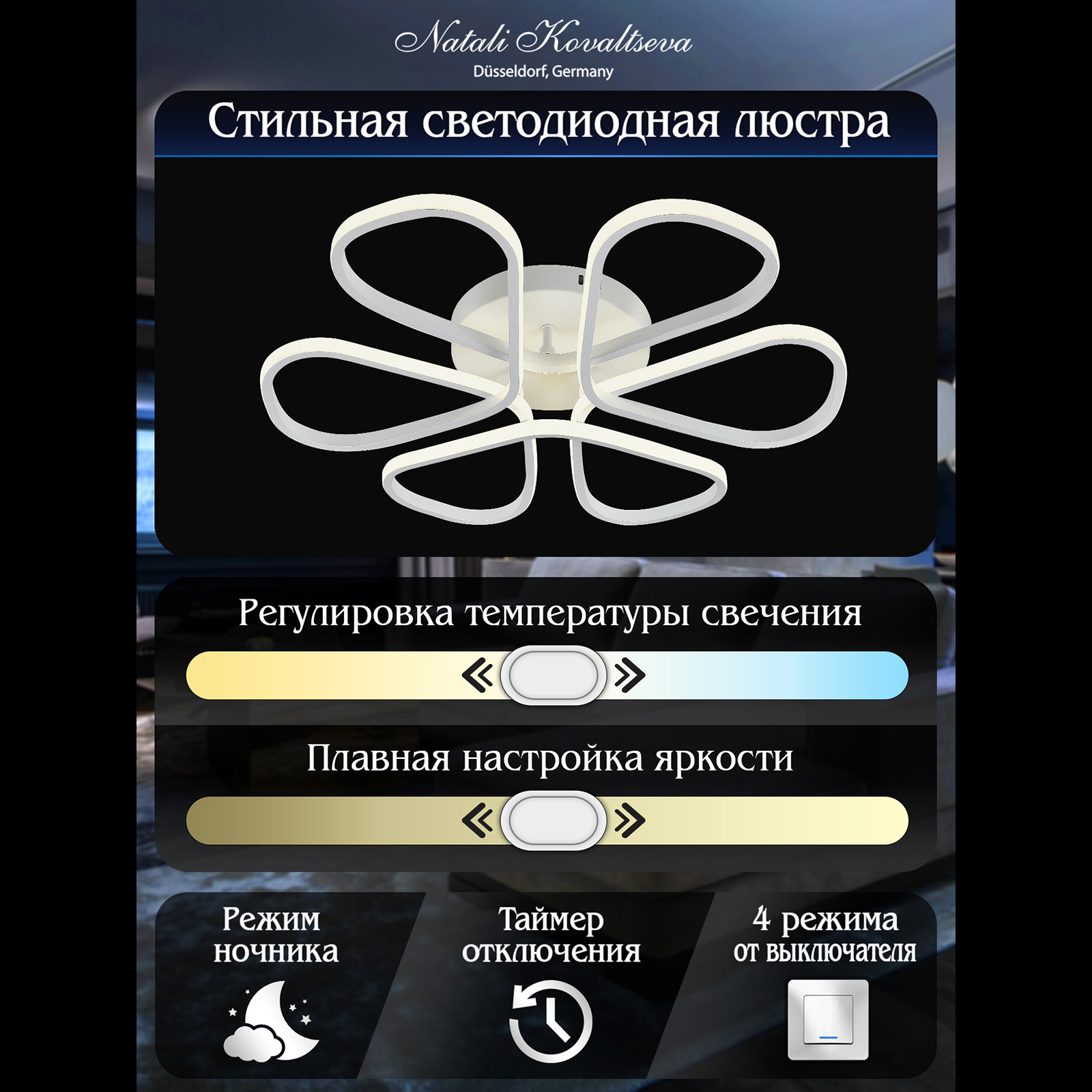 Светодиодный светильник с дистанционным управлением через пульт ДУ, смартфон, планшет. Данная модель имеет футуристичный дизайн. Рожки плавно переходят друг в друга, что подчёркивает элегантность и улучшает рассеивание света. Люстра выполнена в белом цвете и отлично подойдёт в любой интерьер. Люстра имеет тёплый, естественный и холодный свет с регулировкой температуры свечения. Обладает плавной настройкой яркости в диапазоне от 10% до 100%. Имеется режим ночника и таймер отключения. Кроме того, от стандартного выключателя люстра имеет 4 режима свечения. Данные функции делают светильник оптимальным в процессе использования. Общая мощность 120W со световым потоком 9600 lm позволяет осветить до 24 кв.м. Он прост в сборке, установке и экономичен в обслуживании. Светодиоды легко заменимы в случае перегорания. Люстра подойдёт для всех видов потолков. Цветовая температура настраивается от 3000 до 6500 K. Степень защиты 20 IP.