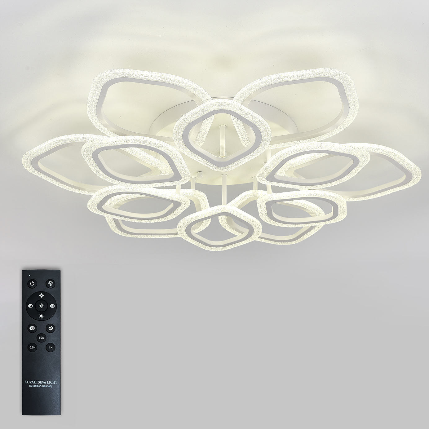 Люстра оснащена светодиодными лампами, что обеспечивает высокую энергоэффективность и долговечность. Общая мощность 240W со световым потоком 15120 lm позволяет осветить до 32 кв.м. Благодаря пульту дистанционного управления, вы можете легко регулировать яркость света, а также выбирать желаемый цвет освещения (теплый, холодный, нейтральный), создавая идеальную атмосферу в любой комнате.