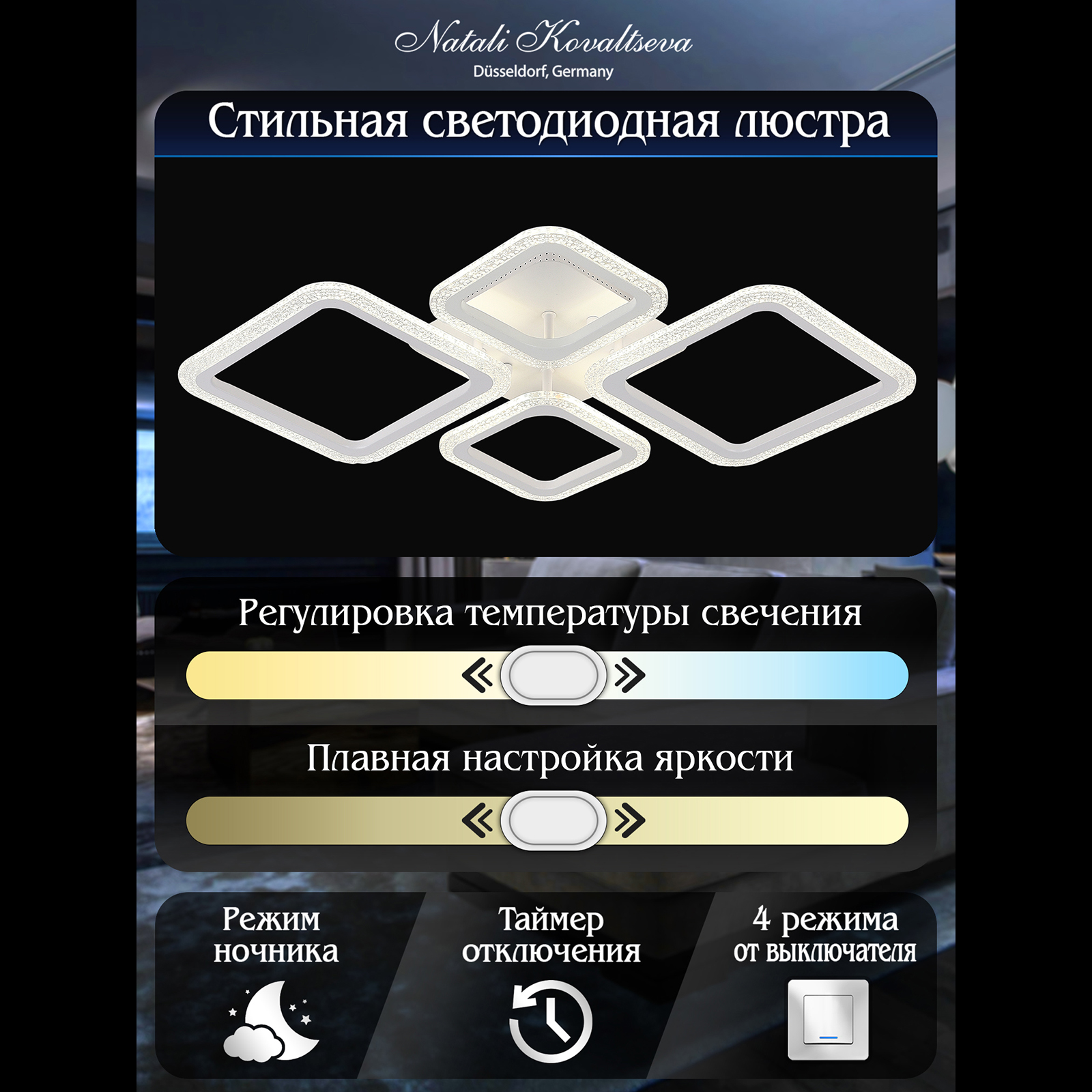 Люстра потолочная светодиодная с пультом ДУ от бренда Natali Kovaltseva представляет собой современное и функциональное решение для освещения вашего дома. Светильник выполнен в стиле хай-тек, который хорошо сочетается с современным интерьером, а также может стать отличным дополнением к классическому или модернистскому дизайну.