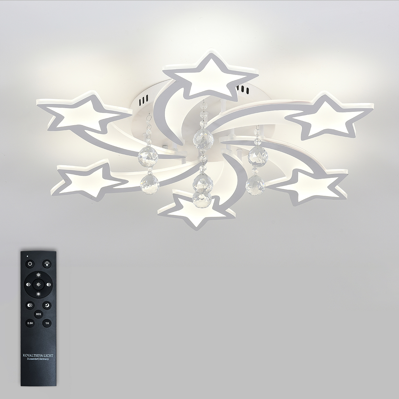 Люстра оснащена светодиодными лампами, что обеспечивает высокую энергоэффективность и долговечность. Общая мощность 160W со световым потоком 11000 lm позволяет осветить до 27 кв.м. Благодаря пульту дистанционного управления, вы можете легко регулировать яркость света, а также выбирать желаемый цвет освещения (теплый, холодный, нейтральный), создавая идеальную атмосферу в любой комнате.