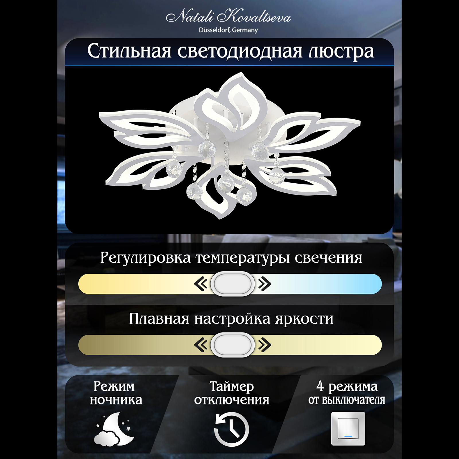 Люстра потолочная светодиодная с пультом ДУ от бренда Natali Kovaltseva представляет собой современное и функциональное решение для освещения вашего дома. Светильник выполнен в стиле хай-тек, который хорошо сочетается с современным интерьером, а также может стать отличным дополнением к классическому или модернистскому дизайну.