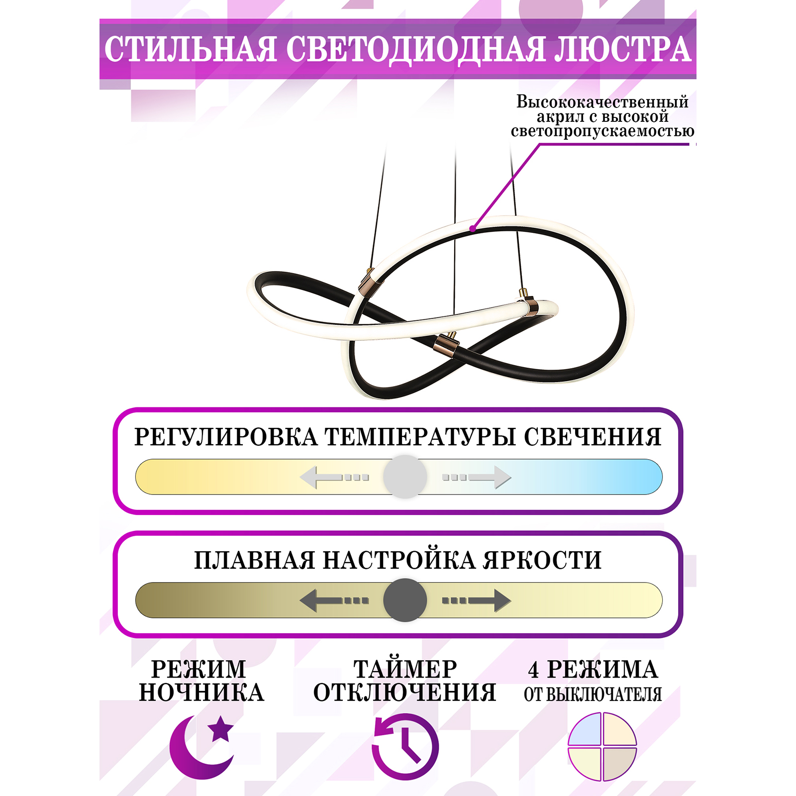 Новая технологичная модель с голосовым управлением и возможностью создания различных сценариев при помощи Яндекс Алиса, Siri. Светодиодная люстра поддерживает управление через пульт ДУ, смартфон, планшет и станет отличным дополнением к Вашей экосистеме умного дома. Люстра имеет круглую, витиеватую форму с эстетическим дизайном, выполненным в чёрном цвете. По периметру располагается контурное свечение, благодаря которому светильник подойдёт в любой интерьер. Высота люстры регулируется. Люстра имеет тёплый, естественный и холодный свет с регулировкой температуры свечения. Обладает плавной настройкой яркости в диапазоне от 10% до 100%. Имеется режим ночника и таймер отключения. Кроме того, от стандартного выключателя люстра имеет 4 режима свечения. Данные функции делают светильник оптимальным в процессе использования. Общая мощность 100W со световым потоком 7500 lm позволяет осветить до 19 кв.м. Он прост в сборке, установке и экономичен в обслуживании. Светодиоды легко заменимы в случае перегорания. Люстра подойдёт для всех видов потолков. Цветовая температура настраивается от 3000 до 6500 K. Степень защиты 20 IP.
