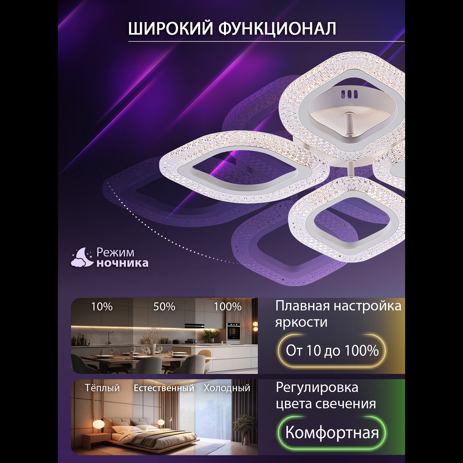 Люстра оснащена светодиодными лампами, что обеспечивает высокую энергоэффективность и долговечность. Общая мощность 48W со световым потоком 4200 lm позволяет осветить до 14 кв.м. Благодаря пульту дистанционного управления, вы можете легко регулировать яркость света, а также выбирать желаемый цвет освещения (теплый, холодный, нейтральный), создавая идеальную атмосферу в любой комнате.