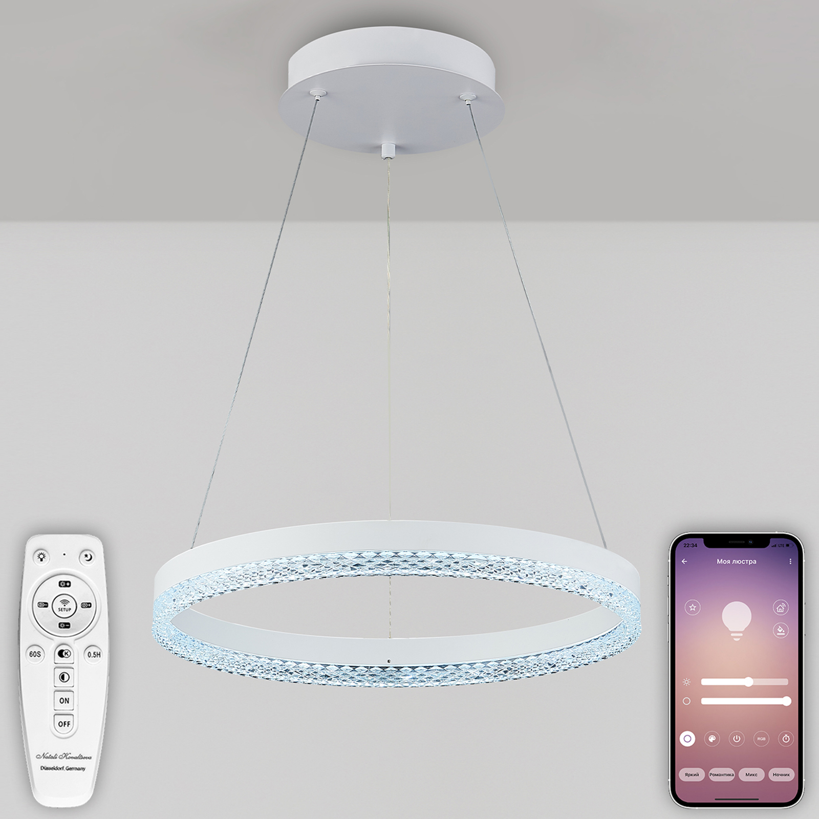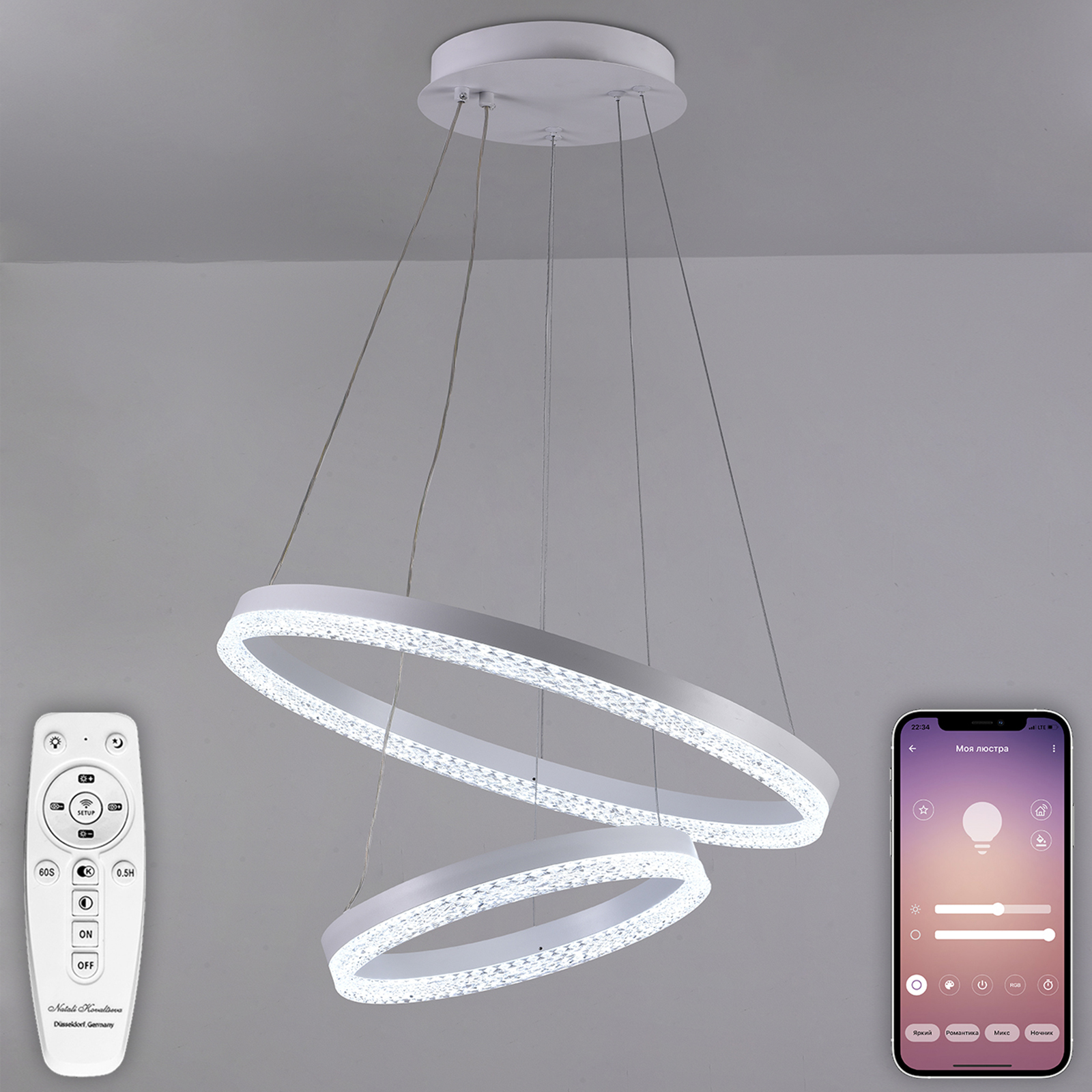 Люстра оснащена светодиодными лампами, что обеспечивает высокую энергоэффективность и долговечность. Общая мощность 120W со световым потоком 9900 lm позволяет осветить до 22 кв.м. Благодаря пульту дистанционного управления, вы можете легко регулировать яркость света, а также выбирать желаемый цвет освещения (теплый, холодный, нейтральный), создавая идеальную атмосферу в любой комнате.